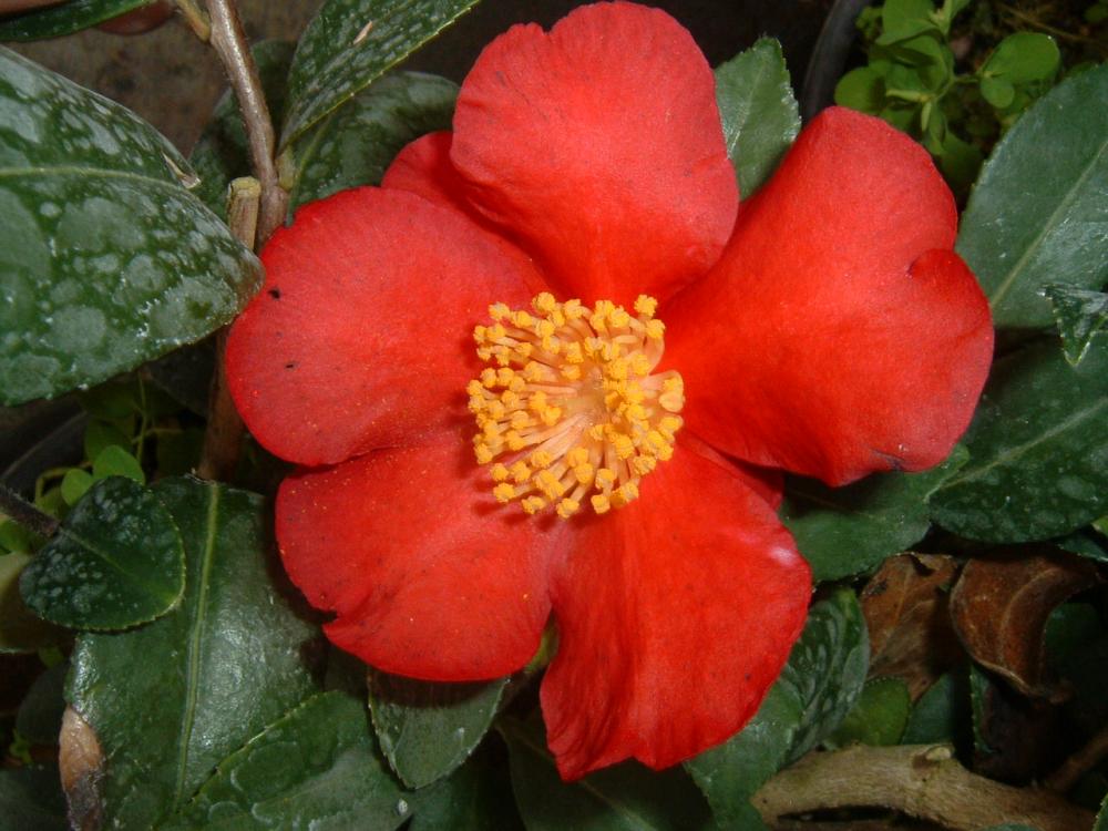 Esemplare di Camelia yuletide h. m. 5+ Pianta sempreverde acidofila, crescita lenta buona resistenza freddo (-10°), fiore semplice rosso brillante, fioritura autunno/inverno.